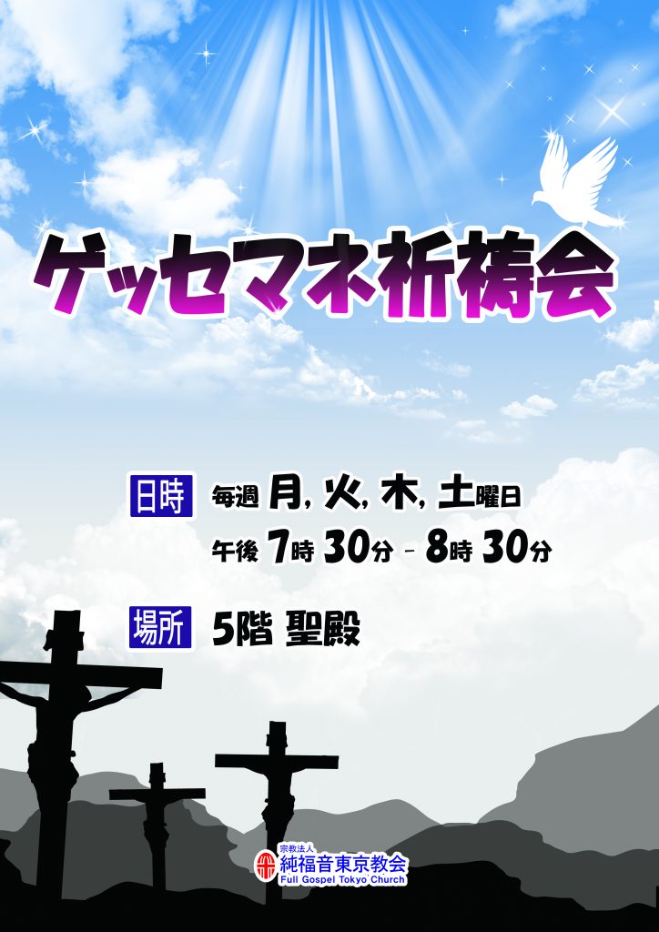 7月开始、每周礼拜一、礼拜二、礼拜四、礼拜六的下午7点半~8点半在5楼圣殿进行客西马尼祷告会。想要参加的请参加。