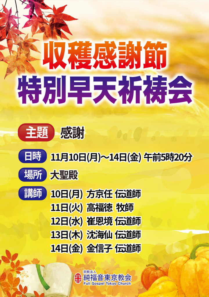 11月10日(月)~14日(金)、毎朝午前5時20分から収穫感謝節特別早天祈祷会が行われます。