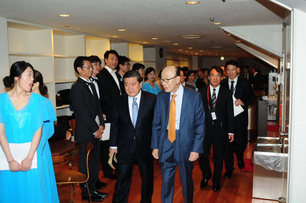 会場入りするチョウヨンギ総裁牧師、志垣重政担任牧師