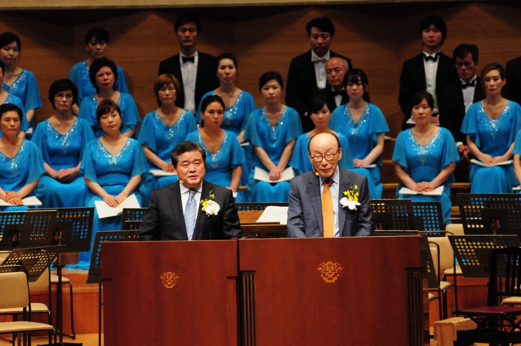 通訳される志垣重政担任牧師とチョウヨンギ総裁牧師