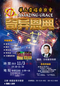 中国の魂を愛する志垣重政担任牧師先生の導きによって行われた2015ハッピーコンサートチャイナでは、才能溢れる中国教区の音楽家達が素晴らしい歌と演奏を神様に捧げました。また、台湾ティエンウィン合唱団の素晴らしい賛美は会場を大きな感動で包みました。