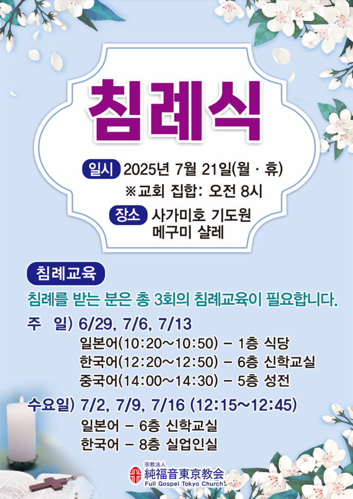 7월 21일 (월・휴일)에 사가미호기도원 메구미샬레에서 침례식이 있습니다. 침례받기를 희망하시는 분은 교구장에게 신청하고 3회에 걸친 침례교육을 받으시기를 바랍니다.