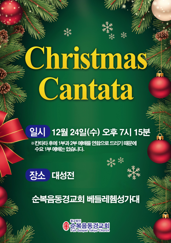 12월 24일 (수) 오후7시15분부터 Christmas Cantata가 있습니다.