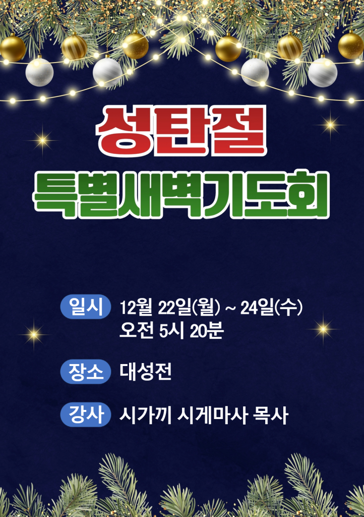 12월 22일(월) – 24일 (수) 오전 5시 20분부터 성탄절 특별새벽기도회 있습니다.
