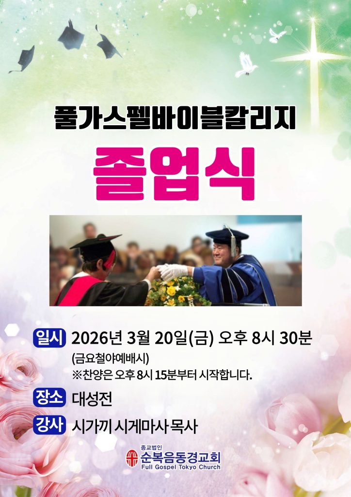 3월 20일 금요철야예배 때에 대성전에서 풀가스펠바이블칼리지 졸업식이 있습니다.