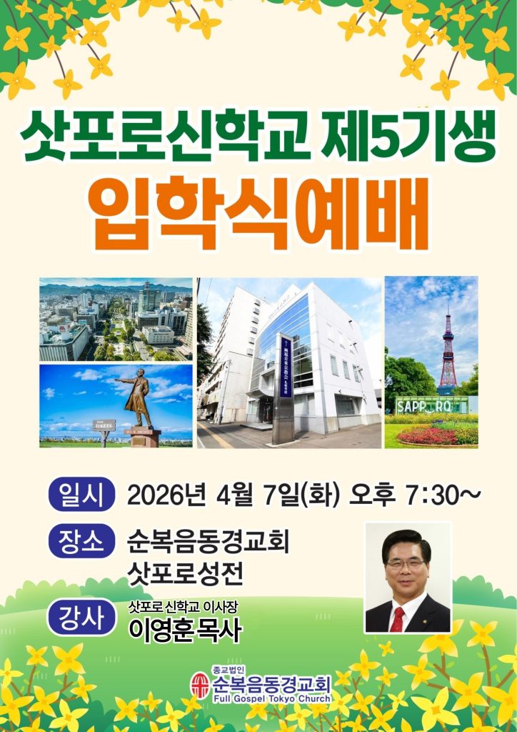 4월 7일(화) 오후7시 30분부터 삿뽀로성전에서 삿뽀로신학교 5기생 입학식 예배가 있습니다.