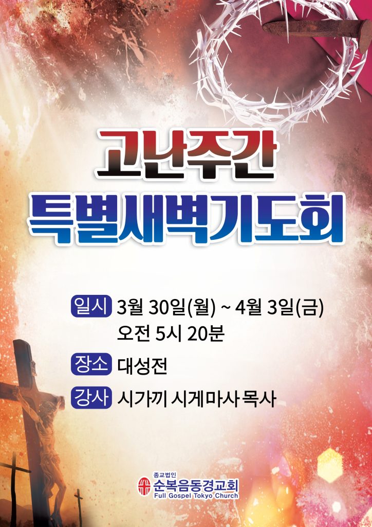 3월 30일(월) – 4월 3일 (금) , 매일 오전 5시 20분부터 고난주간 특별새벽기도회가 있습니다.