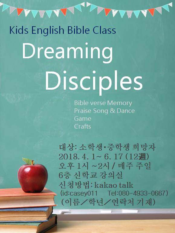 4월 1일(주일) 부터 교회학교에서는 소학부를 대상으로 영어 성경말씀을 배우는 「Dreaming Disciples」를 시작합니다. 매주 주일13시 ~ 14시 6층 신학교실에서 있습니다.