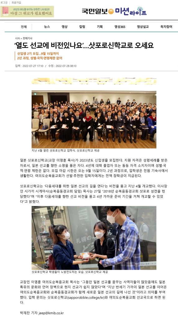 「列島宣教にビジョンがありますか」札幌神学校に来てください。-7月28日付国民日報記事