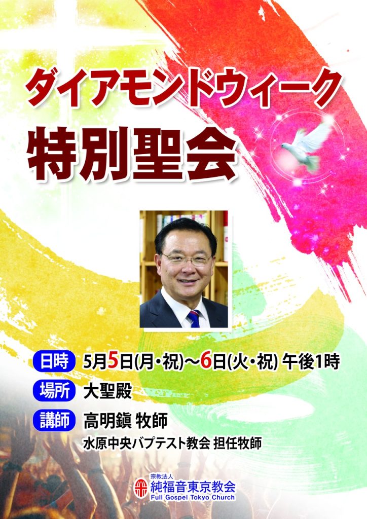 5月5日(月)~6日(火)午後1時から高ミョンジン先生のメッセージでダイアモンドウィーク特別聖会が行われます。 多くの方を招いてご参加ください。
