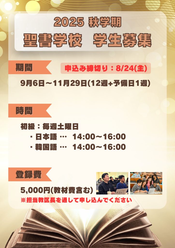 9月6日(土)より聖書学校(初級)が開講されます。受講希望者は教区長を通して申し込んでください。