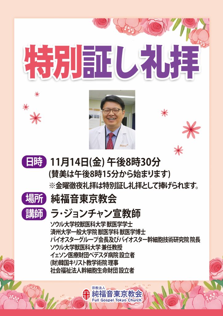 11月14日(金)午後8時15分から特別証し礼拝があります。多くの人を伝道して一緒に参加しましょう。