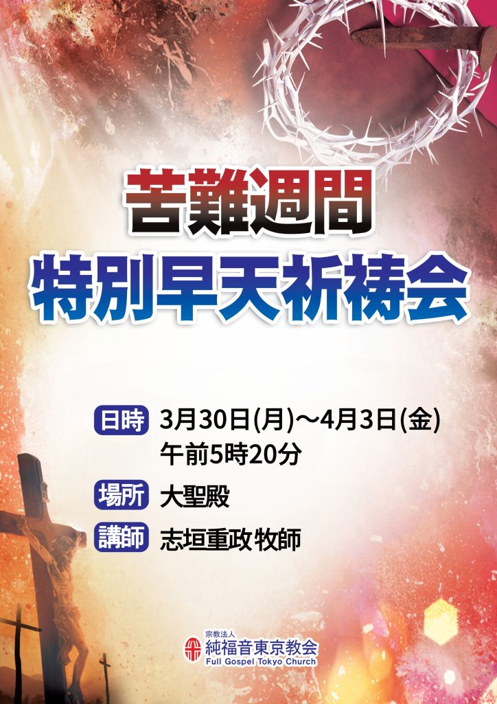 3月30日(月)~4月3日(金)、毎朝午前5時20分から苦難週間特別早天祈祷会が行われます。