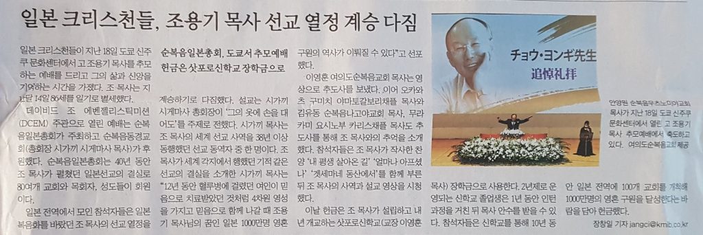 チョウ・ヨンギ先生の追悼礼拝が10月18日(月)午後1時から新宿文化センターで行われ、22日付の韓国国民日報の記事として報道されました。